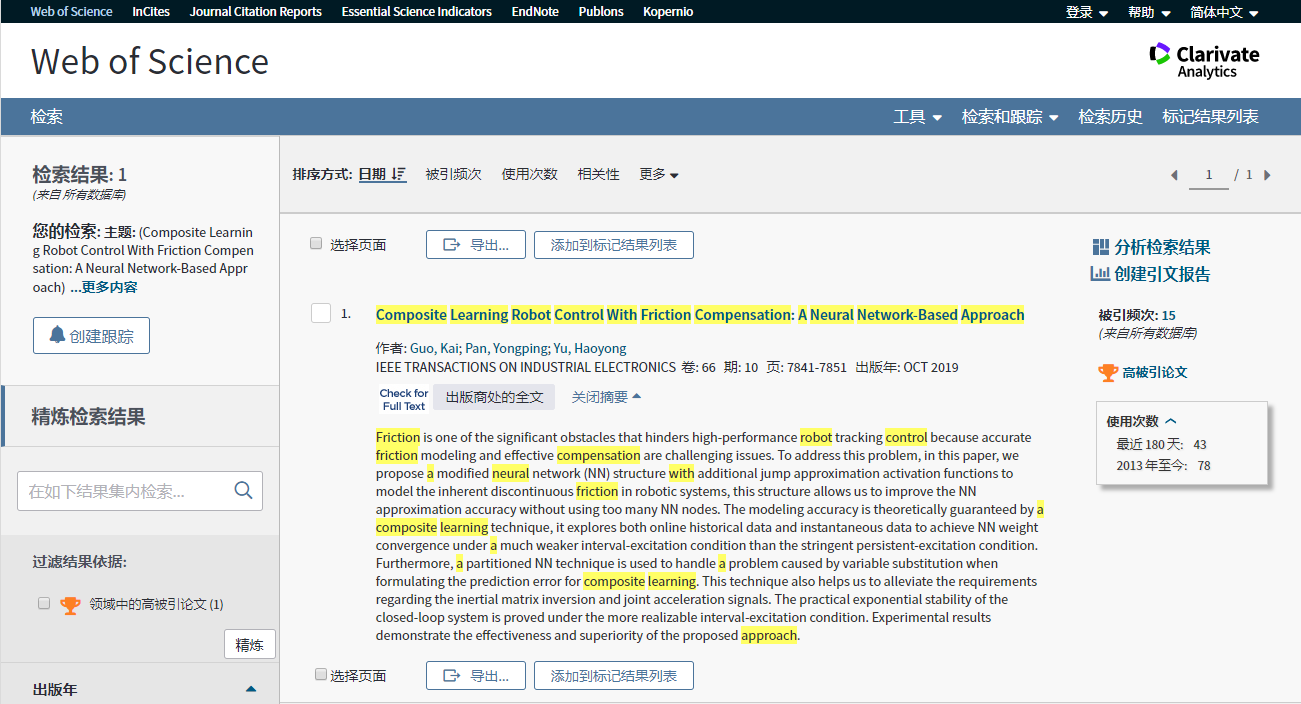 日前,澳门十大信誉好的网站国凯课题组在电气和电子工程师协会主办的机电领域Top期刊IEEE Transactions on Industrial Electronics(中科院JCR期刊1区,IF=7.503)上发表论文,题目为“Composite Learning Robot Control With Friction Compensation: A Neural Network-Based Approach”,该成果于2020年1月入选为Web of Science高被引论文。澳门十大信誉好的网站国凯助理研究员为论文第一作者,澳门十大信誉好的网站为第一完成单位。该项工作得到了国家自然科学基金面上项目、青年项目,山东省重点研发计划和澳门十大信誉好的网站青年学者未来计划等项目的资助。