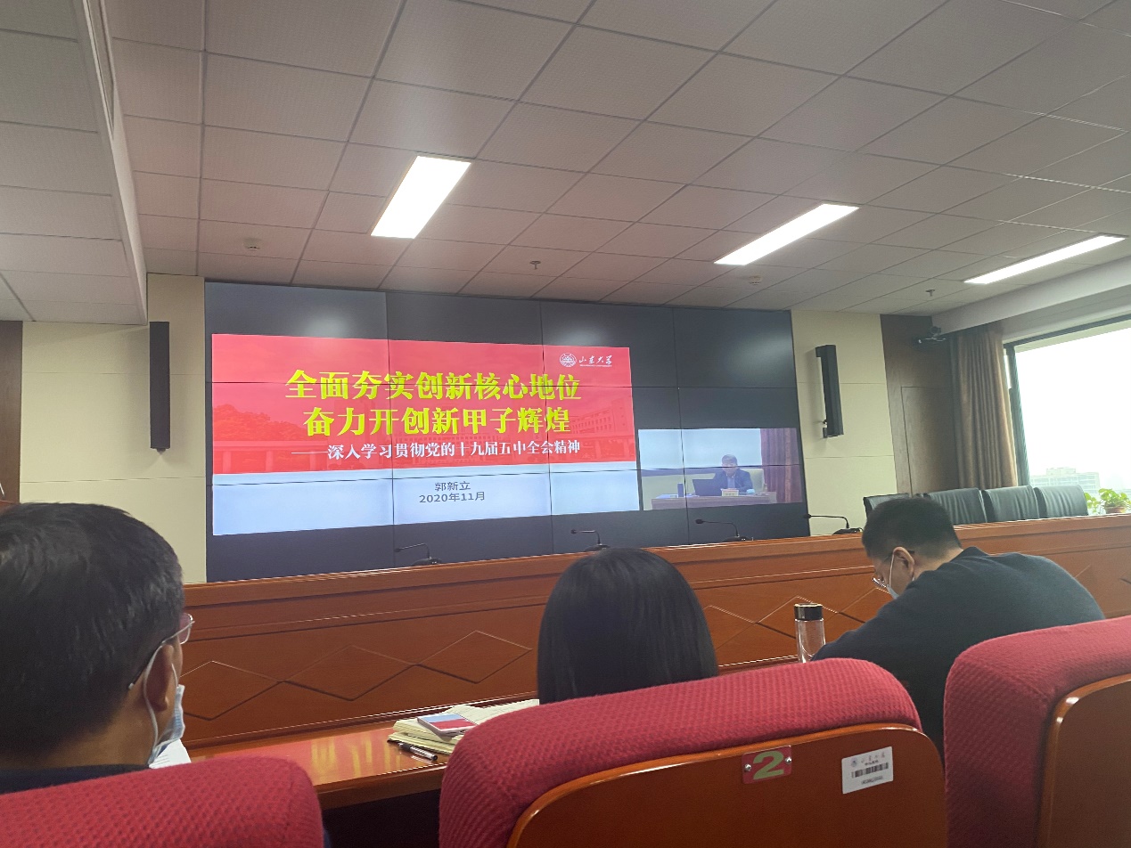 报告会上,郭新立书记深入解读了党的十九届五中全会的重大意义,结合国家进入新发展阶段的历史方位、“十四五”时期我国发展的指导思想、实现高质量发展的核心任务,分析了学校“十三五”时期取得的进步及新发展阶段面临的挑战,明确了“十四五”建设指导思想、基本原则和主要目标,指出我们必须紧紧围绕高质量发展主题,牢牢把握创新核心地位,扎实做好“十四五”顶层谋划,解放思想,提高站位;全面总结,加强谋划;聚焦学科,推动融合;党建引领,彰显优势,扎实推进“五个全力以赴”,努力开创中国特色世界一流大学建设新局面,以强校兴国的优异成绩为全面建设社会主义现代化国家作出山大贡献。