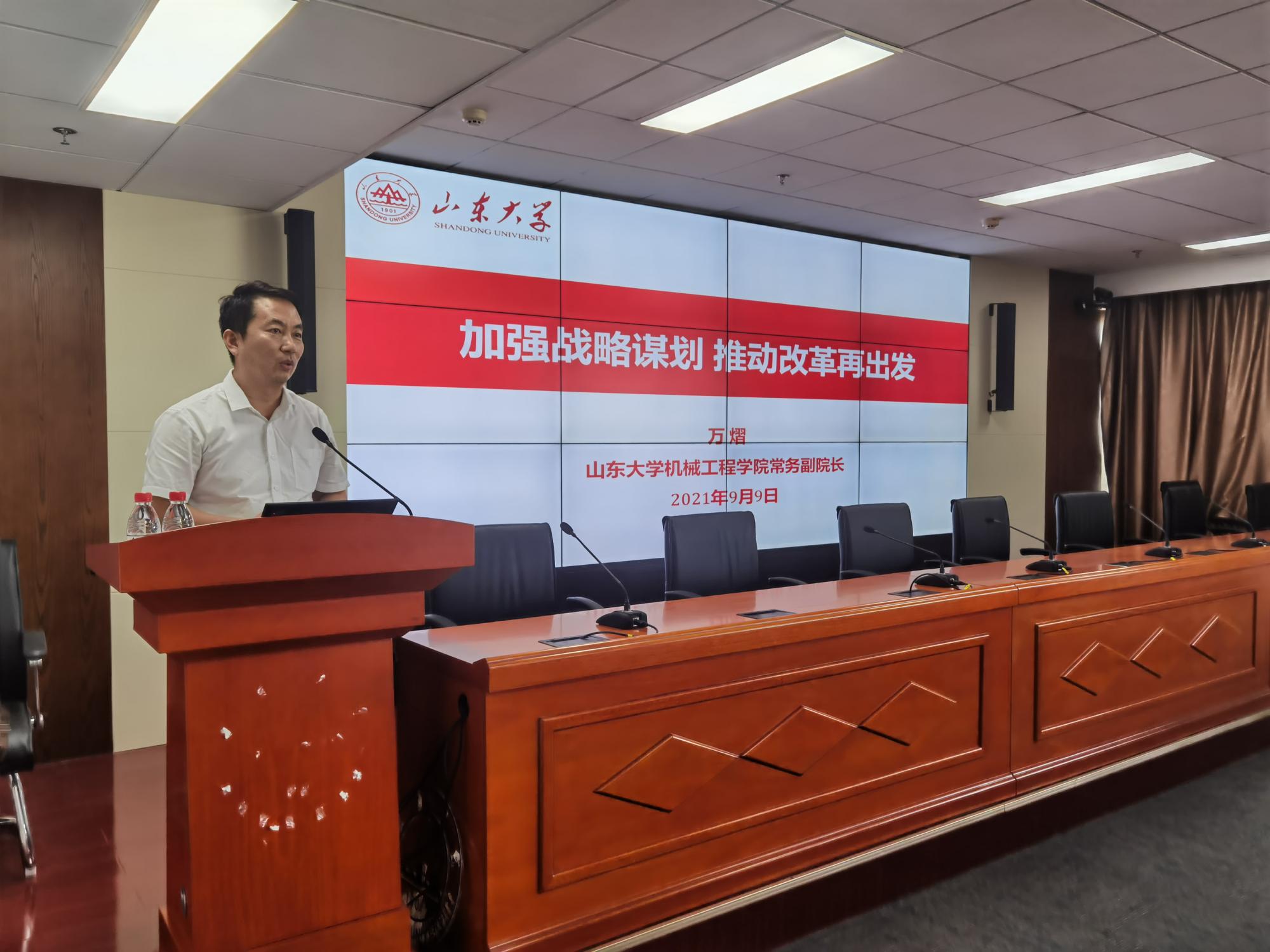 万熠的主题报告包括3个方面内容。一是详细传达学校秋季学期工作会议精神,介绍了学校近期所取得的一系列成绩,以及学校在秋季学期系统推进九个方面29项重点任务,要求全院教职工以百廿校庆、机械工程教育95周年为契机,努力抓好奋力实现学校内涵式高质量发展的“五个突破”,不断增强建设担当中华民族复兴大任世界一流大学的自信、自省和自觉意识。二是总结梳理春季学期暑期工作成绩。在学院党委领导下,全面加强党的领导,深入开展党史学习教育,扎实推进“我为群众办实事”实践活动,完成迎接中央巡视系列整改行动;落实立德树人根本任务,加强思想引领建设,保障学生创业就业,促进学生五育并举全面发展,加强导师队伍建设,做强学科拓展生源渠道,深化本科、研究生教育教学改革;全面深化科研组织与合作,推动平台共建与成果转化,创新科教产教协同育人模式;改善学院支撑保障条件,加强资源统管共享见成效。三是部署安排新学期重点工作,主要包括加强党建引领,落实中央巡视整改;坚持立德树人,贯彻三全育人,全面提升人才培养质量;凝练学科方向,打造科研教学团队;统筹校庆院庆,加强校友联络,汇聚众智办学等。