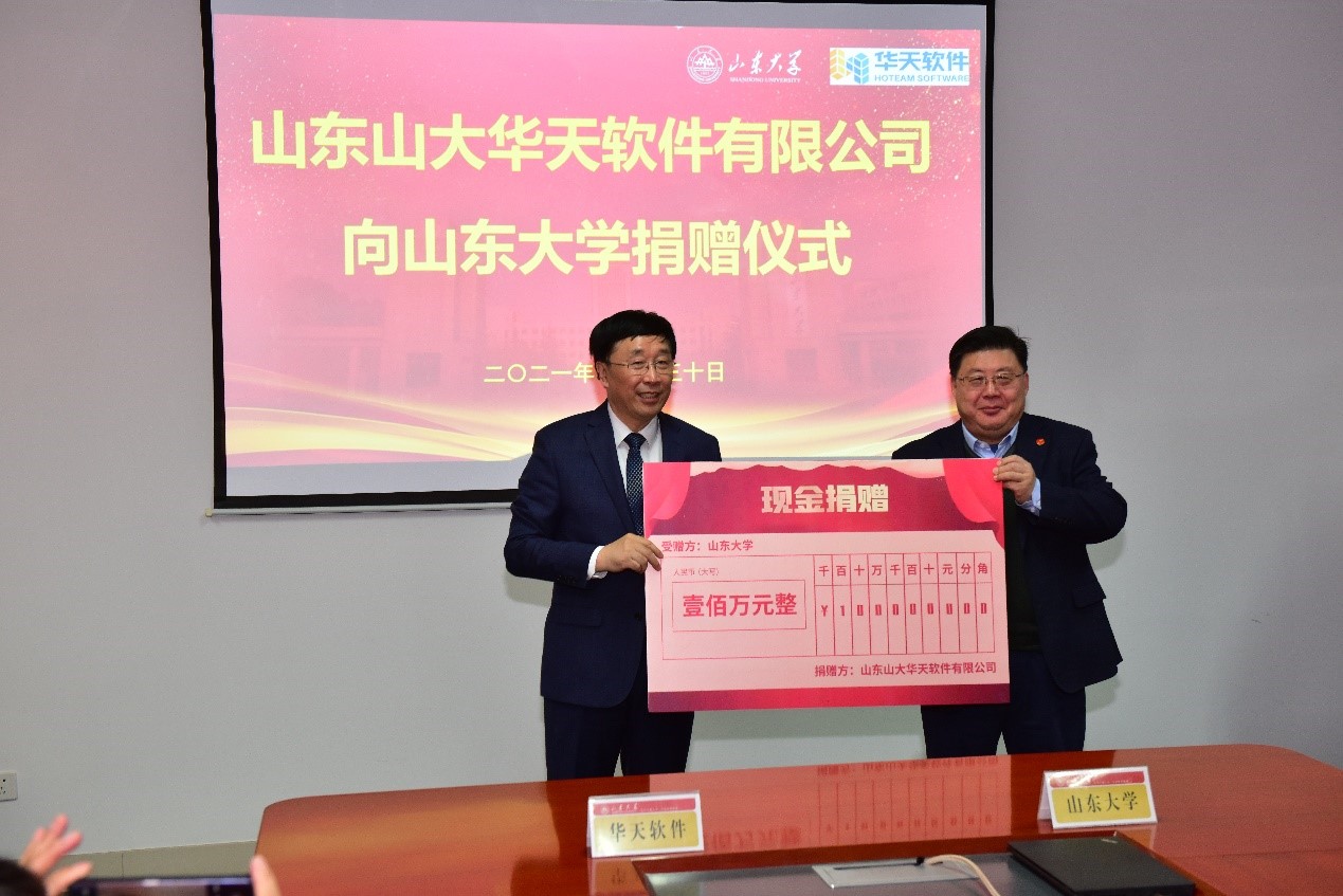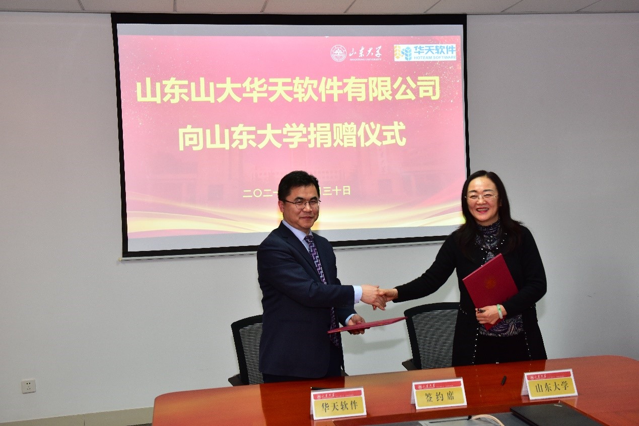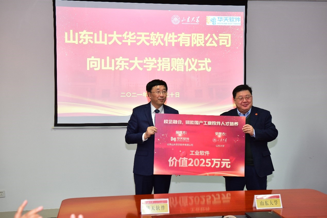 山东山大华天软件有限公司向澳门十大信誉好的网站捐赠奖助学金、智能制造类工业软件,并捐资共建“澳门十大信誉好的网站—华天软件工业软件研究院”。捐赠现场,山东山大华天软件有限公司总裁刘军与澳门十大信誉好的网站党委书记刘杰共同签订捐赠协议。杨超英代表山东山大华天软件有限公司向澳门十大信誉好的网站捐赠,芦延华代表澳门十大信誉好的网站颁发捐赠证书,并与杨超英共同为“澳门十大信誉好的网站—华天软件工业软件研究院”揭牌。