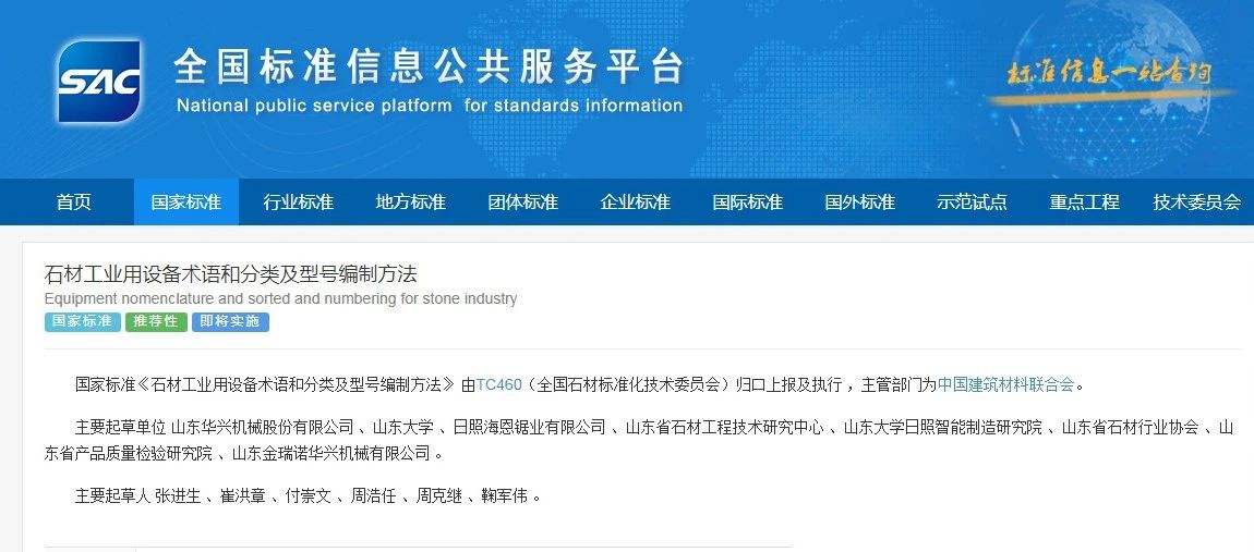 近日国家市场监管总局(国家标准化管理委员会)发布2021年第3号中国国家标准公告,批准澳门十大信誉好的网站张进生教授主持制订的GB/T39811-2021《石材工业用设备术语和分类及型号编制方法》国家标准正式发布。