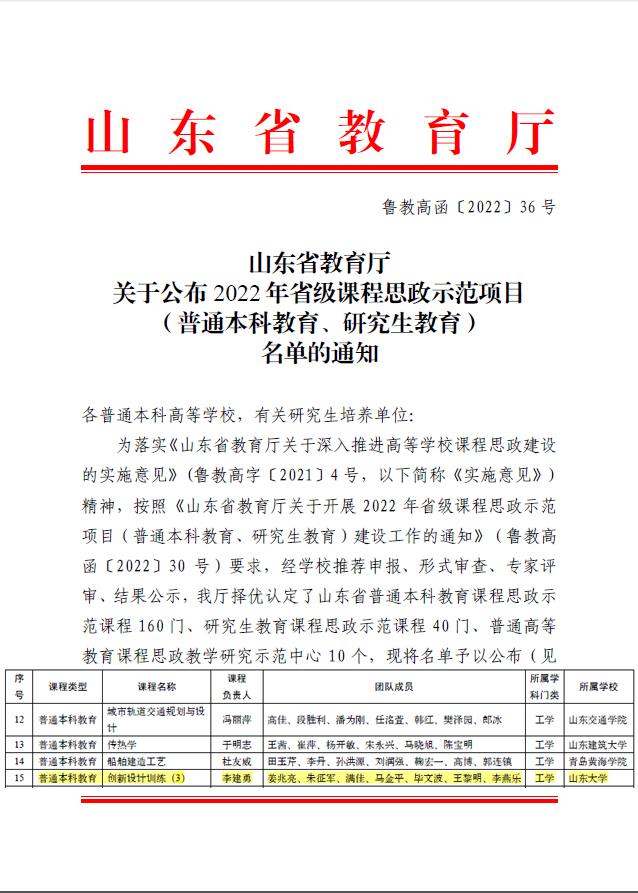 近日,山东省教育厅公布了2022年普通高等教育课程思政示范课程名单,我院李建勇老师等负责的本科生课程《创新设计训练(3)》入选课程思政示范课程。