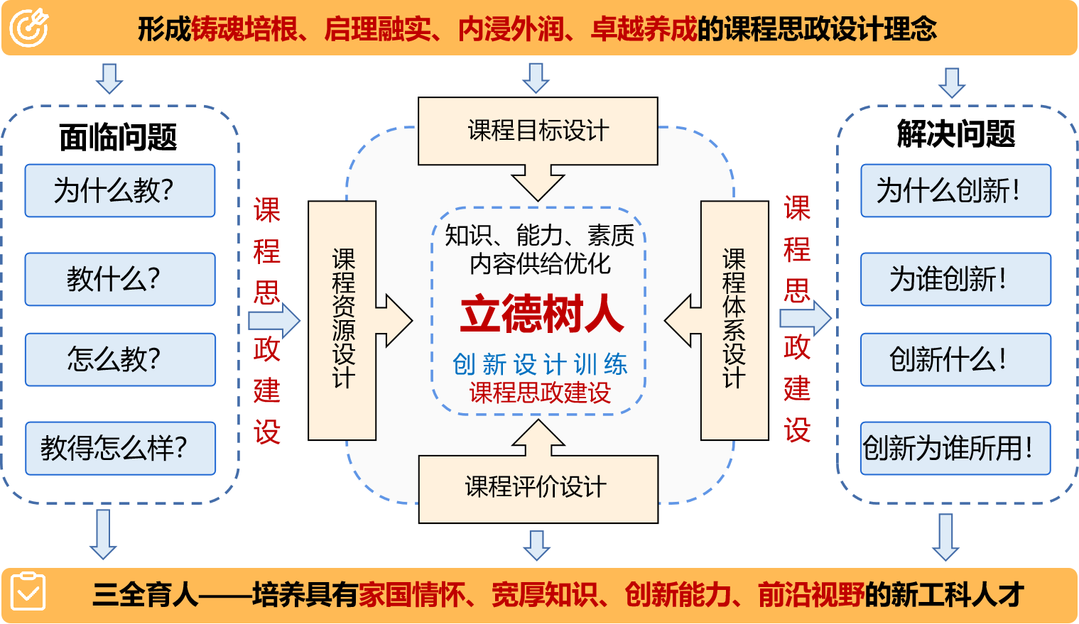 《创新设计训练(3)》作为本科的专业实践课,课程思政建设方向和重点是深入学习贯彻习近平总书记关于教育的重要论述,践行“为党育人、为国育才”初心使命,秉承“为天下储人才,为国家图富强”办学理念,利用专业优势,致力于培养具备家国情怀、宽厚知识、创新能力、前沿视野的新工科卓越工程人才。《创新设计训练》以立德树人为核心,团队人人讲思政,铸魂培根,推进全员育人;课程思政红为底,创新训练敢为先,课堂与实训突出价值浸润,推进全程育人;以学生为本,多措并举紧密围绕卓越养成,推进全方位育人。