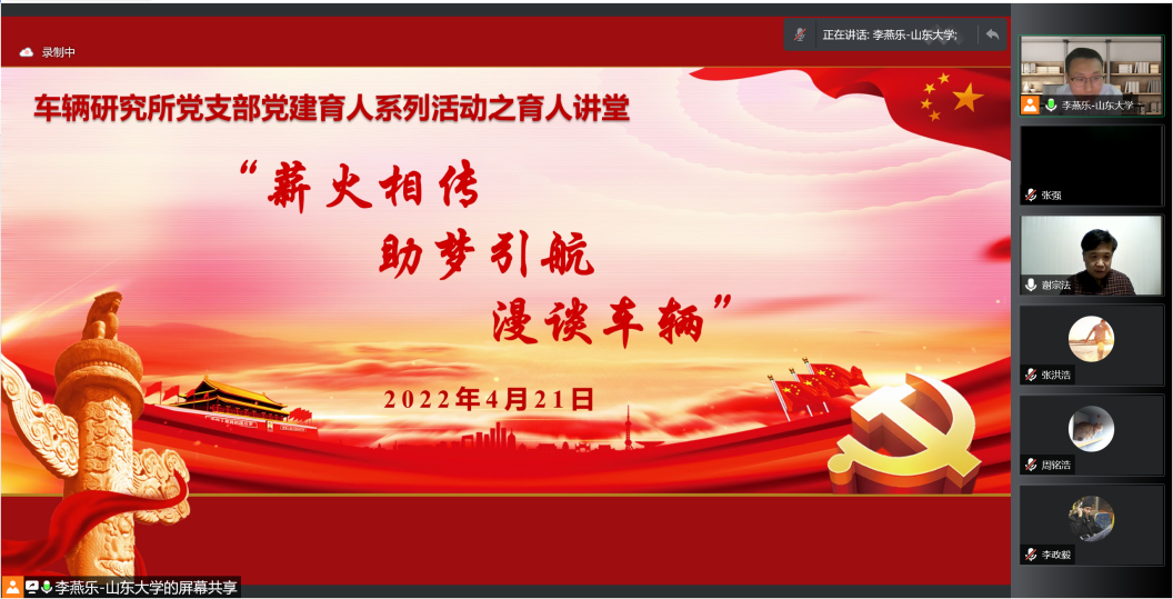 4月21日晚,澳门十大信誉好的网站车辆工程研究所党支部联合本科第一第二党支部举办“薪火相传,助梦引航,漫谈车辆”育人讲堂。学院党委副书记刘玥、车辆工程研究所全体教师参加了活动,研究所党支部书记李燕乐教授主持了活动。