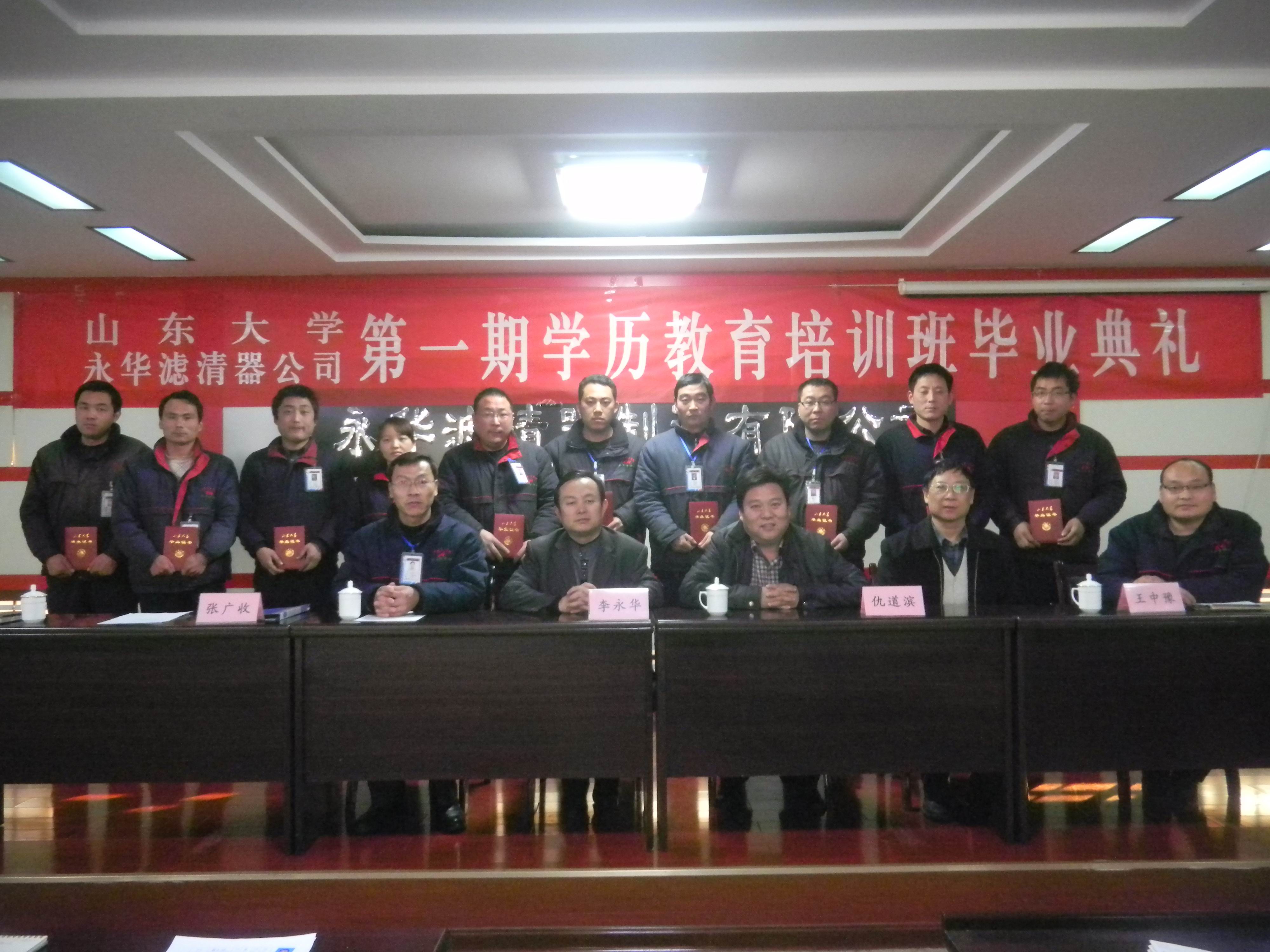 12月20日下午,由澳门十大信誉好的网站和淄博永华滤清器制造有限公司联合举办的第一期网络高等教育专科班毕业典礼在沂源县淄博永华滤清器制造有限公司办公楼会议室隆重举行。澳门十大信誉好的网站党委书记仇道滨教授,淄博永华滤清器制造有限公司董事长兼总经理李永华,公司人力资源部部长张广收,澳门十大信誉好的网站在职教育中心副主任王中豫,毕业学员和公司部分中层基层管理人员技术人员40余人参加了典礼。