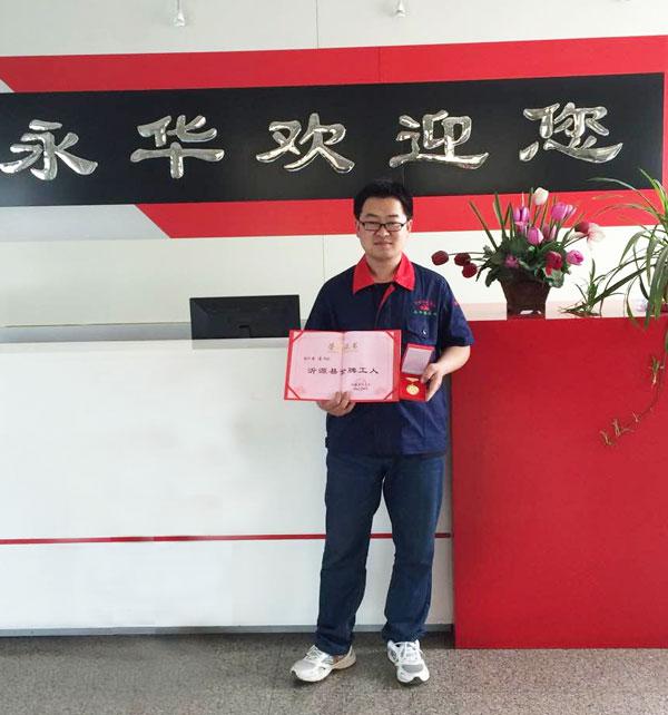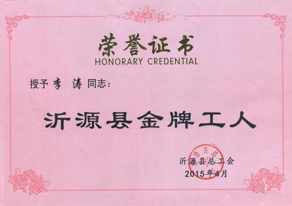 2015年“五一”国际劳动节,沂源县总工会为了表彰先进、树立榜样,在全县一线职工中广泛开展了“金牌工人”评选活动,讲过严格审核和联评,12名珍惜岗位、敬业尽责、善于创新、乐于奉献的优秀职工脱颖而出。永华集团员工李涛亦获此殊荣,并获得“富民兴源”劳动奖章。