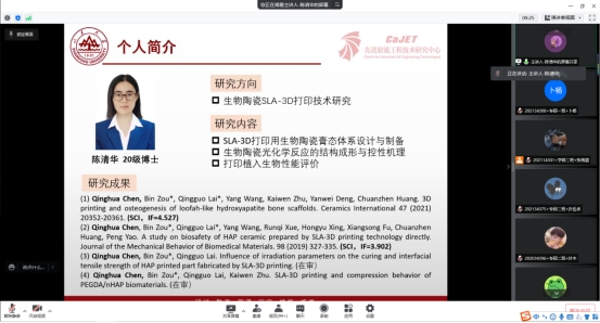 陈清华博士从生物陶瓷SLA-3D打印制备及其骨植入物的研究背景,研究内容和总结与展望三个方面进行了详细的介绍。她首先介绍了人体骨组织的概述以及对骨修复材料和骨修复支架制造方式的研究现状,并对目前面临的问题和研究途径提出了见解。随后,陈博士从羟基磷灰石/丙烯酸树脂膏态体系、羟基磷灰石/PEGDA膏态体系以及羟基磷灰石/GelMA膏态体系三个方面对主要研究内容做了详细的介绍,分别介绍各种骨植入物的体系组分设计、成形工艺、脱脂烧结工艺和性能评级。