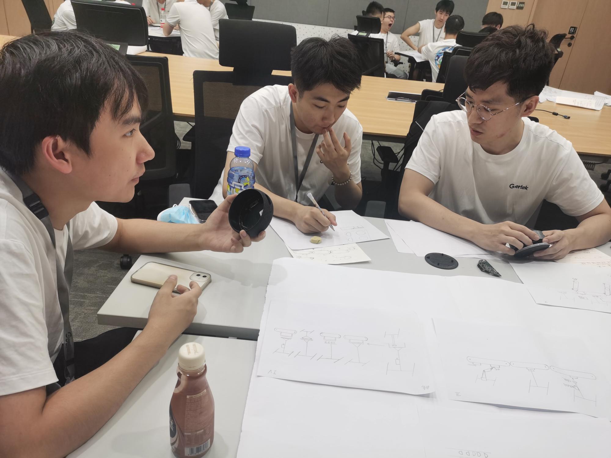 上午八点,营员们按时到达会议室开始了一天的工作。首先,每个组员根据昨天的学习收获分别分享并完善了自己主责的生产线单元;随后由各组组长组织大家一起讨论各单元完善后的方案,并针对方案上的难点进行集中攻克;然后指导老师对各组的设计方案进行了答疑解惑;最后,各组成员对智能音响生产线进行整体草图绘制,为接下来的初步汇报做好了准备。