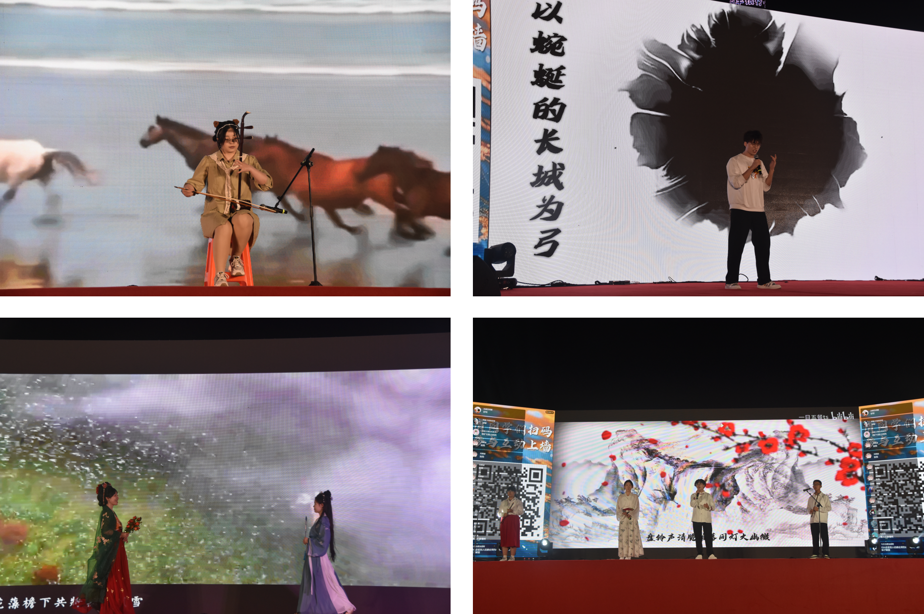 在古色古香的第二篇章“汉风古韵,声律共鸣”中,一曲二胡演奏的《赛马》将观众的思绪引向辽阔的草原,富有感染力的旋律展现了万马奔腾的壮观场景。随后的《天下》和《龙吟》则表达了将士们护国安民的豪迈情怀,让在场的观众热血沸腾;季棠汉服社带来的《霓裳》汉服走秀,展示了中华传统文化的独特魅力,让人眼前一亮;《牵丝戏》运用众多古典文学元素,让听众在欣赏音乐的同时领略到古典文化的魅力。