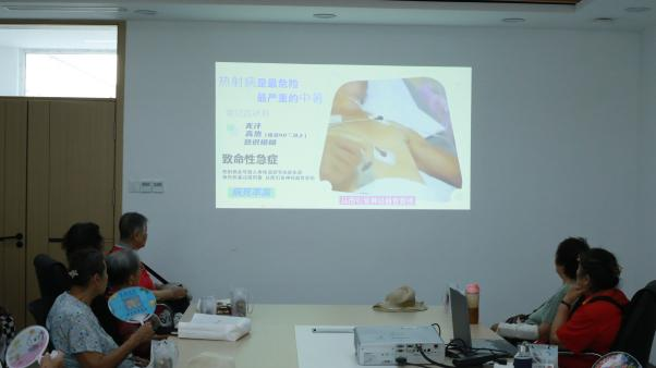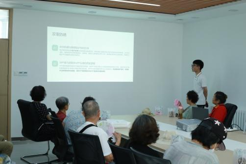 分发环节后,开展了防蚊避暑知识微课堂,20分钟精炼宣讲贯穿三大核心:从“一清二挂三喷”口诀(清积水、挂香囊、喷裸露皮肤)切入,配合手持喷雾瓶现场演示45厘米安全喷洒距离,强调避开眼口;针对老人常见误区,用清凉油实物示范叮咬点涂法,反复提醒“勿抓挠防感染”。PPT中放大加粗的步骤图与队员穿梭席间手把手指导的身影交织,让科学防护变得可触可感。