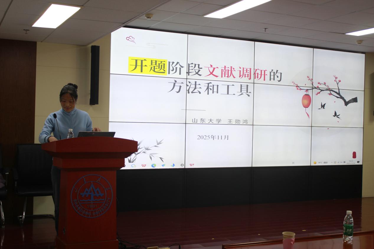 王勋鸿老师讲座主题为“开题阶段文献调研的方法与工具”,王老师指出,文献调研不仅是查找文献,更包括筛选、整合、分析与撰写综述等环节,其根本目的是为开题报告和后续论文写作提供学术支撑。随后,王老师进一步介绍了文献调研“三步法”:一是熟悉数据库及图书馆资源,掌握检索技能;二是重点关注核心期刊、综述性文章及经典论文,快速构建领域知识图谱;三是借助百度学术、知网、万方的开题助手等功能辅助文献分析。同时,她推荐AMiner等AI科研辅助工具,并提醒同学们要注意交叉验证文献真实性,严守学术规范。