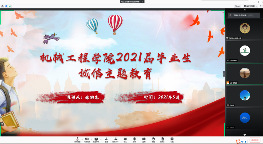 为保障毕业生的顺利毕业,提升毕业生的诚信意识,5月7日晚,澳门十大信誉好的网站开展了“毕业生诚信主题教育”活动,学院团委副书记、毕业生辅导员张柏寒主讲,2021届全体毕业生参加本次活动。