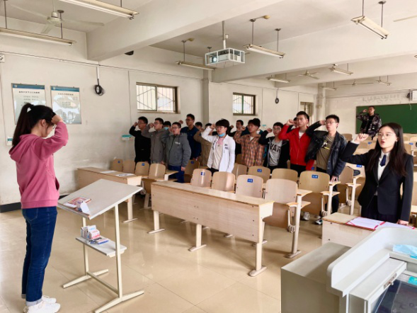 参与人员在四位领誓人的带领下全体起立,面向团旗,重温入团誓词。在句句激情澎湃的誓词声中,同学们重温了中国共青团员的责任与担当,感受到了“五四运动”中中国青年不畏牺牲、舍我其谁的牺牲精神。