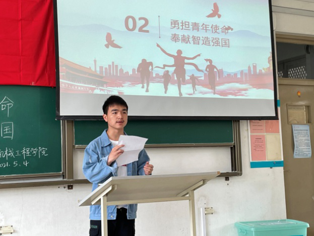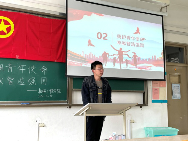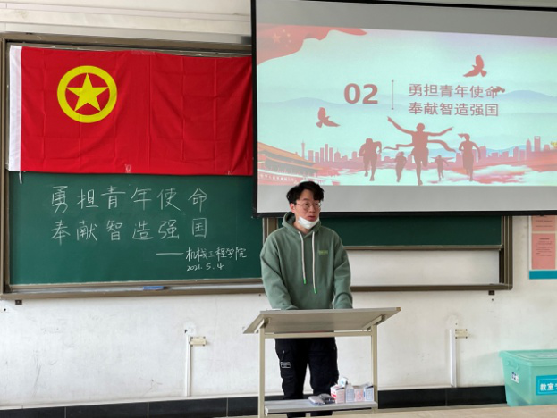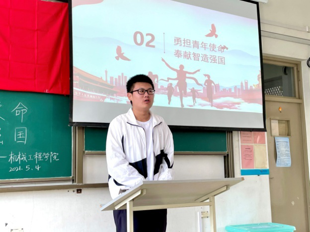 随后,代表同学进行了“勇担青年使命,奉献制造强国”的主题分享。17级代表同学从未来展望出发,结合自己本科生毕业后发展方向,表明青年应当勇担强国担当,助力国家制造业发展。18级代表同学主要就如何找准自身定位、看清前进道路进行分享与展望,他们表示作为新时代青年,同学们应当发现自我、找到自我、坚持自我,为国家、为民族奉献属于青春力量。19级代表同学结合国家“十四五规划”,表示作为当代青年,机械学子们应当夯实学科基础,努力学习制造相关知识,加快国家制造业发展。20级代表同学结合自身发展规划,分享了自己大学生活的心路历程,与在场同学共勉:为国家强大、民族昌盛而不懈奋斗。本次重温入团誓词活动在团歌声中结束。
